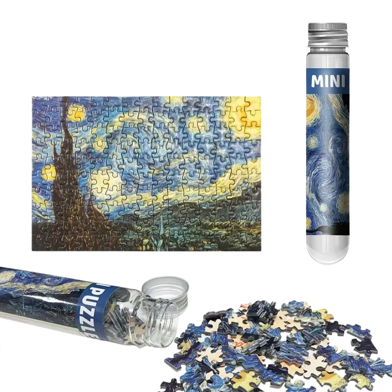 This Famous Painting Mini Puzzle Set In Tube features iconic artwork, offering a fun and compact puzzle experience. The set comes with 150 small pieces and a reference image for guidance, making it a creative activity for art fans.