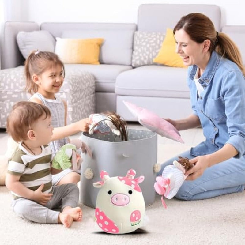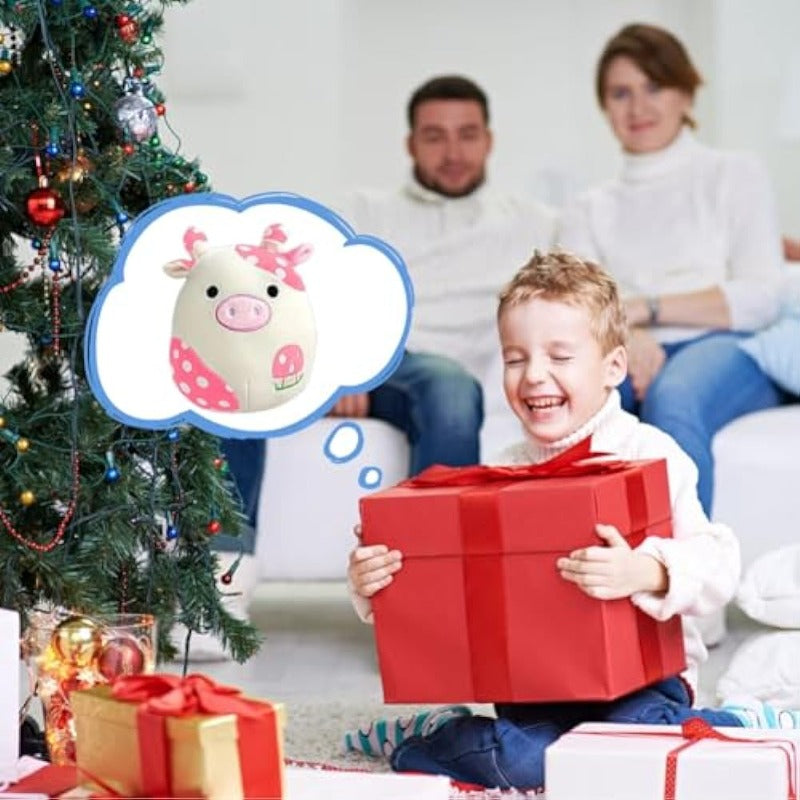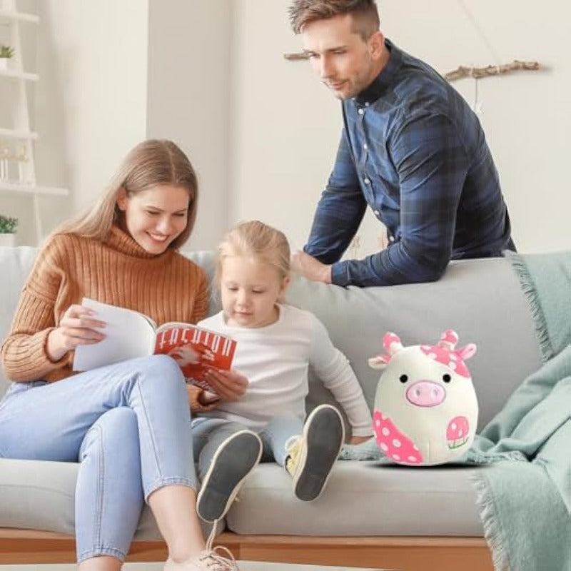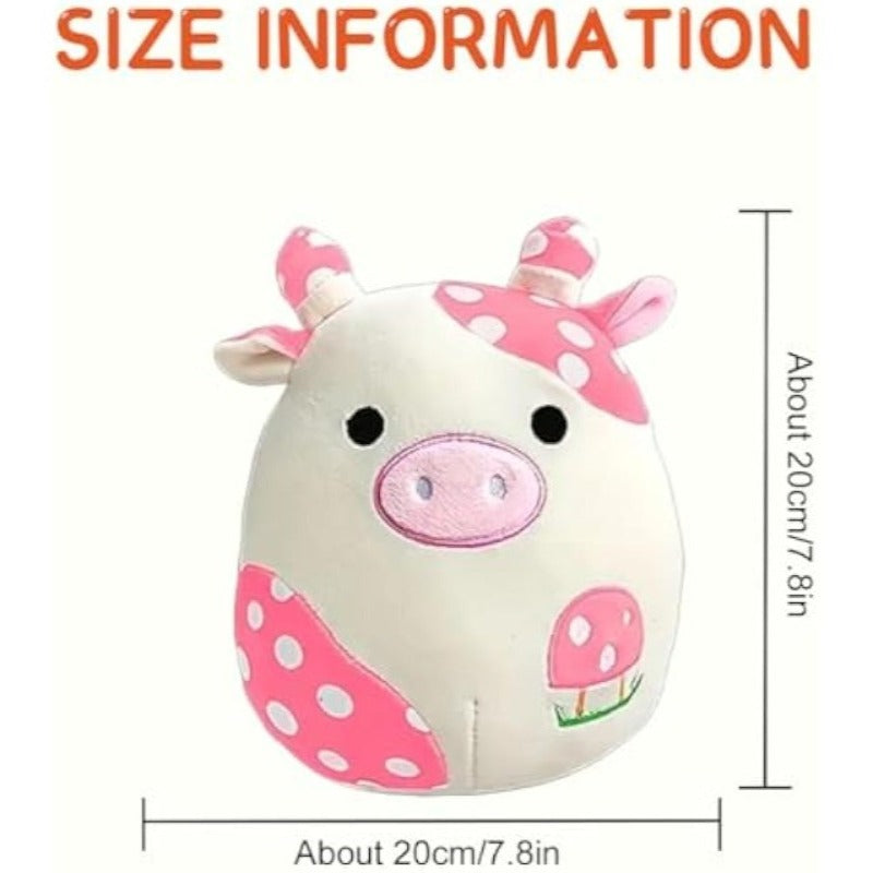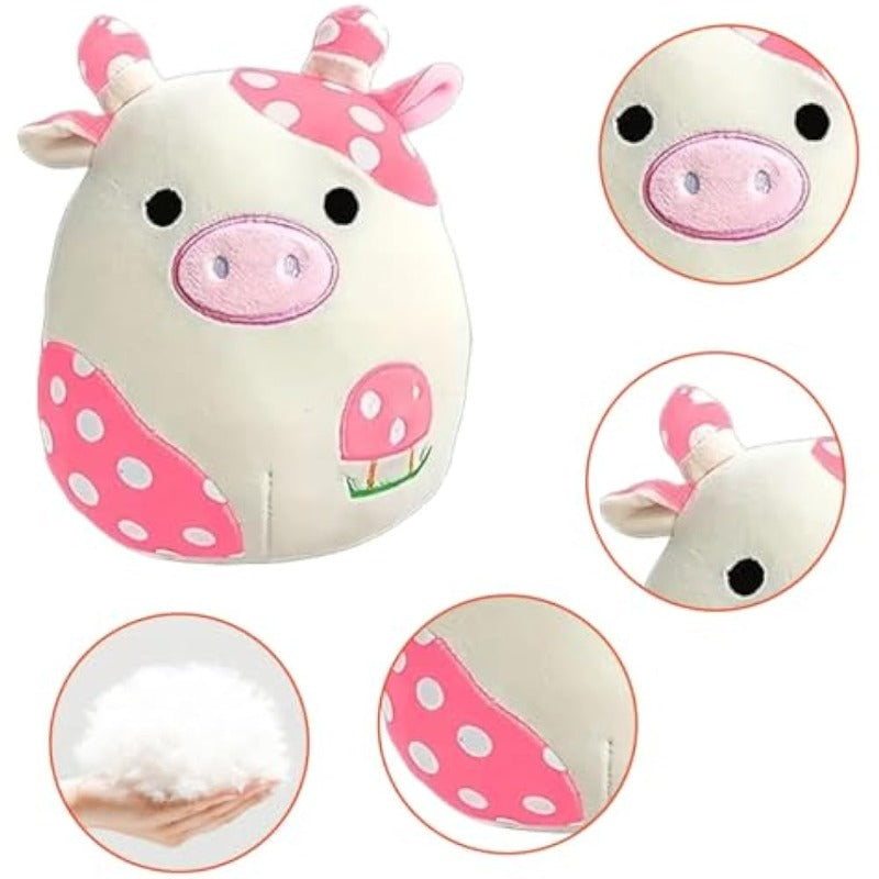 Cuddle up with the coziest member of the barnyard with this Pillow Soft Cow Stuffed Animal Toy. Boasting an irresistibly plush adorned with charming pink spots and a sweet mushroom motif, this stuffed cow is an amusing addition to any plush collection. Perfect for embracing or resting your chair, it's not just a toy but a cloud-soft friend ready to bring comfort and smiles.