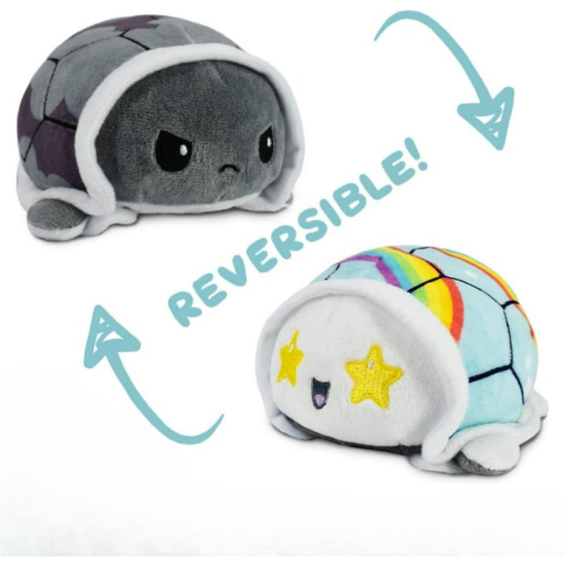 Experience the enchanting transition from day to night with the Reversible Designed Turtle Plush Toy. This adorable plush toy features a unique reversible shell that allows you to flip between two different colors. One side displays a deep, contemplative frown set against a starry night shell, while a simple flip reveals a different expression on a soft grey canvas. This plush is perfect for sharing your perspective.